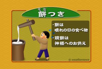 年末に、家族や親戚で集まって餅つき大会という光景を最近ではあまり見かけなくなりました。しかし、多くの家庭では鏡餅を飾り、お正月にお雑煮を食べるのではないでしょうか。このお餅とは「ハレの日」に食べる食べ物で、餅を食べることによって霊魂の再生を図ろうとしました。また鏡餅は、お供え餅ということもあるように、年神様にお供えし、感謝と幸せをお願いするものです。今では、餅つき機なるものも登場していますが、やはり機会があれば、石や木でできた臼(うす)と木の杵(きね)で餅をつきたいものです。
