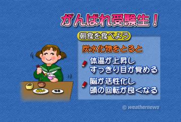 朝食でとる栄養分の中でも、特に炭水化物は体温を上昇させてすっきりと目覚めさせてくれるため、受験生にとって大事な栄養素です。頭の中がぼんやりとしたままでは、考えることも記憶することも、能率の悪いものになってしまうためです。