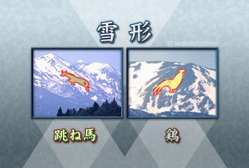 例えば、新潟県の妙高山(みょうこうさん)では、「跳ね馬」と呼ばれる馬が跳ねたような姿が現れ、これは雪のない所が馬の形になっている「ネガ型」です。