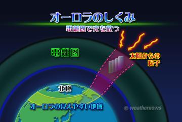 しかし地球は磁場によって守られているため、この粒子は、北極や南極の磁場のすき間からわずかに入り込むか、太陽と反対側の地球から十分に離れた磁場の弱い所から突入するしかありません。北極や南極の磁場のすき間から粒子が入って来る場合は、太陽の光が当たるため、オーロラの光を確認することはできません。