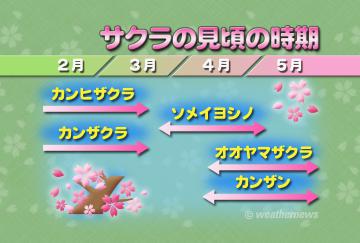 桜はその種類によって、咲く時期に違いがあります。沖縄では、1月のうちからカンヒザクラとよばれる種類の桜が咲き、また本州でも静岡県の熱海あたりでは梅の花が咲くころにカンザクラが咲くようになります。