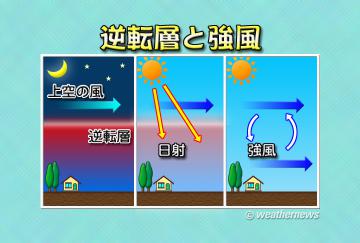 こうなると地上付近の空気と上空の空気を分け隔てていたふたがとれたことになるので、上下の空気は混ざり合い、上空で吹いていた強い風が地上付近にまで降りてくるのです。