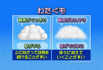 一方、輪郭がぼんやりとしていて底がでこぼこしている雲は、徐々に消えていく傾向にある衰弱期のわたぐもです。