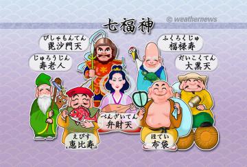 よく年賀状には干支などのおめでたい絵が描かれますが、七福神(しちふくじん)もその中の一つです。七福神や財宝を乗せた宝船の絵は、皆さんもよく見かけることでしょう。七福神とは福徳をもたらす神様で、一般には恵比寿(えびす)、大黒天(だいこくてん)、毘沙門天(びしゃもんてん)、弁財天(べんざいてん)、布袋(ほてい)、福禄寿(ふくろくじゅ)、寿老人(じゅろうじん)をさします。恵比寿は「えびす顔」ともいうように、にこにことした表情をした漁業や商売の神様で、大黒天は打出の小槌(こづち)を持った福徳や財産を与えてくれる神様で、大黒様とも呼ばれて親しまれています。また毘沙門天は、鎧、甲を身につけた勇ましい姿の神様で、仏法の守護、福徳を授けます。弁財天は七福神の中で唯一の女神で、音楽や芸術、知恵の神様で、布袋は七福神の中でただ一人、実在の人物で中国の禅僧といわれています。福禄寿は頭の長さが特に印象的な神様で、健康や長寿、財産を与えてくれる神様です。寿老人も福禄寿同様に長寿を授ける神様で、鹿を連れていると言われています。
