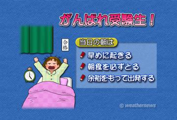 受験シーズンもいよいよ大詰めです。試験を乗り切るためにはそれまでの地道な努力が最も大事ですが、心身ともにベストコンディションで臨むことも大切です。まず受験当日は、早めに起きるようにしましょう。目が覚めてから十分な時間をとることができなければ、試験が始まっても脳を活発に活動させることができません。夜型の生活で受験勉強を続けている方は、早めに朝型の生活に変えておきましょう。また、朝食をきちんと食べることも大事です。集中力を高めたり、脳にエネルギーを与えて記憶や情報伝達の能力を高めるなど、食事は試験で全力を出し切るための手助けをしてくれるのです。さらに早起きをしたなら、朝は時間に余裕を持って出発するようにしましょう。万一の交通機関の乱れなどにも対応できる上、心に余裕を持っていれば、それだけ余計な緊張や心配をしなくて済むようになります。やるだけのことをやったら、あとは自信を持って試験に臨んでください。